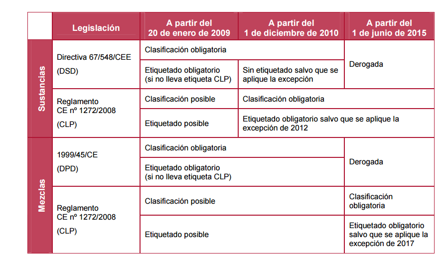 La entrada en vigor del contenido del Reglamento ha sido gradual desde su publicación, y ya desde Junio de 2015 está en vigor en su totalidad. En el caso de las mezclas, el plazo límite de clasificación, etiquetado y envasado con arreglo a las normas CLP es el 1 de junio de 2015. Hasta esa fecha, deberán clasificarse, etiquetarse y envasarse con arreglo a la antigua Directiva de Preparados Peligrosos (En inglés DPD).