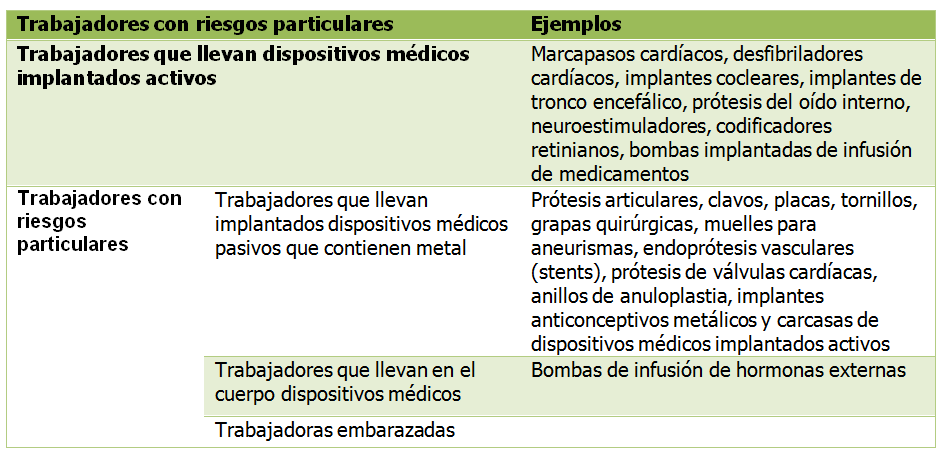 Para ayudar a los empresarios a llevar a cabo una evaluación inicial de su lugar de trabajo, la guía presentan los cuadros 3.1. y 3.2.. El cuadro 3.1. determinan los distintos tipos de dispositivos médicos que pueden verse afectados por los CEM mientras que el 3.2. determina las situaciones de trabajo comunes afectadas.