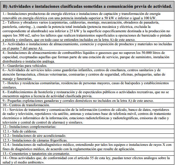 En el anexo II de la presente ley se recoge el listado de actividades e instalaciones sujetas al régimen de licencia administrativa o de comunicación previa.