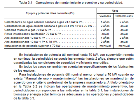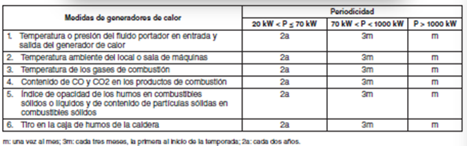 De la misma forma que los mantenimientos preventivos, este tipo de mediciones tienen distinta periodicidad en función de la potencia del equipo, sólo que en este caso se excluye el criterio del uso. Estas evaluaciones las realiza el mantenedor del equipo, de la misma forma que los mantenimientos preventivos, y ha de quedar constancia en el libro de mantenimiento del mismo.