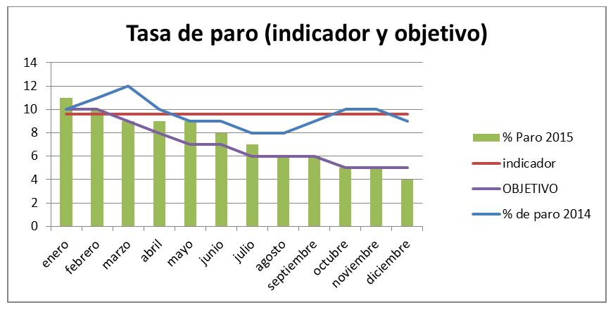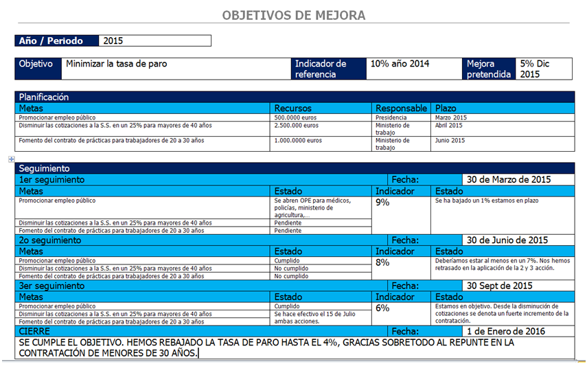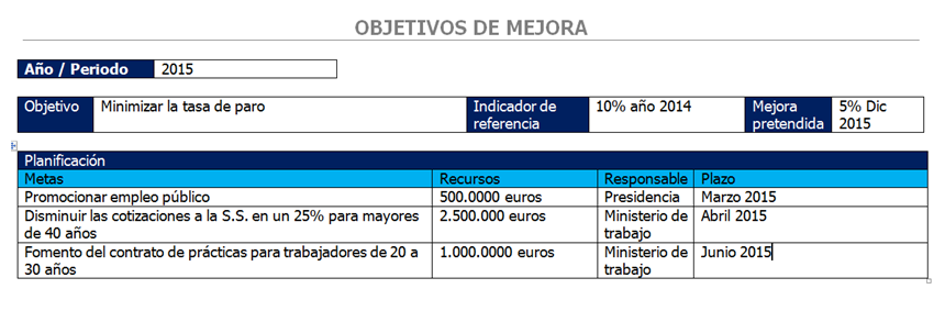 Imaginemos que “Empresia” desarrolla planifica para el año 2015 la mejora de la tasa de paro hasta bajarla hasta un 5%, con respecto a la tasa media de paro del año 2014 (10%). Desde la presidencia se debaten las medidas a tomar, dotación presupuestaria y plazos. Las medidas se concretan en la siguiente planificación: