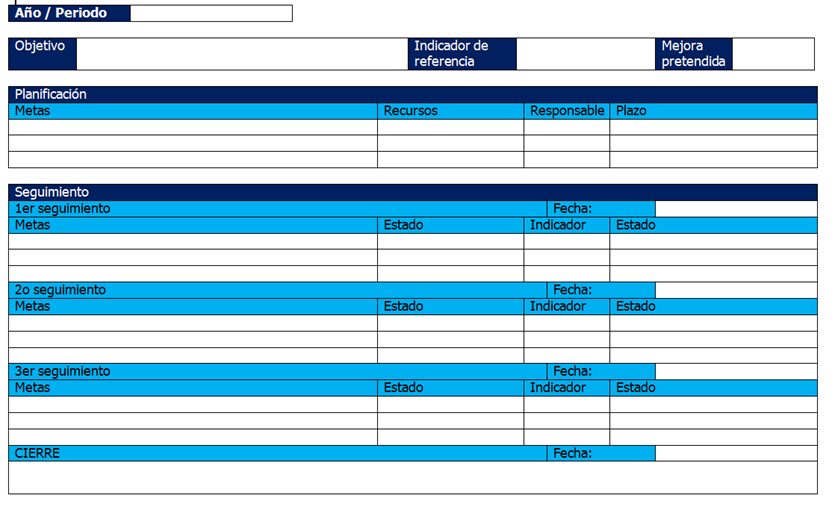 Lo ideal es plantear objetivos de mejora sobre el análisis de los indicadores disponibles del ejercicio anterior, y si no es posible cuantificar una idea de mejora cualitativa sobre la que mejorar el sistema.